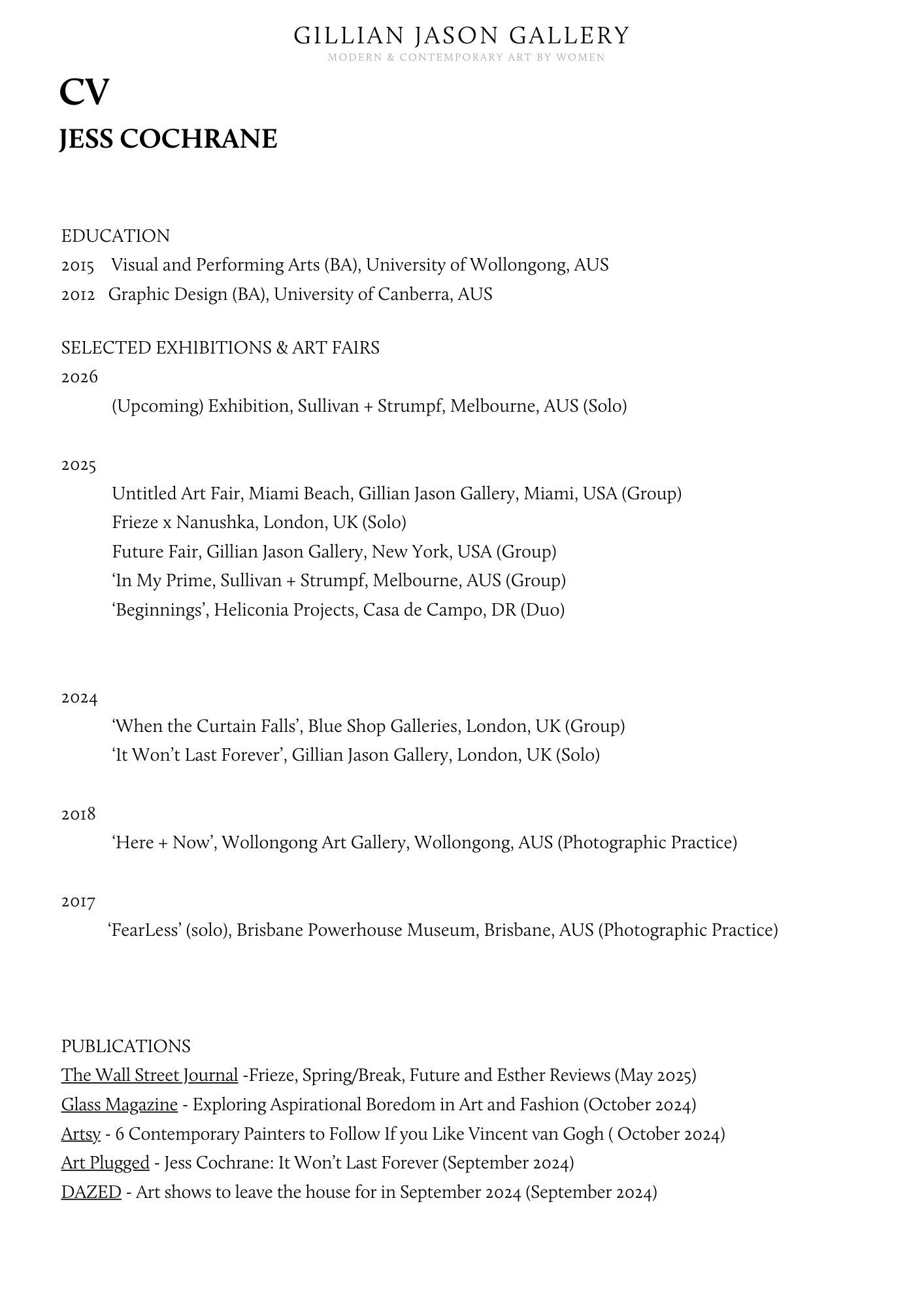 Cochrane holds a BA in Visual and Performing Arts from the University of Wollongong (2015) and a BA in Graphic Design from the University of Canberra (2012). Her work has been exhibited internationally, with recent shows in London, New York, Melbourne, and Casa de Campo. In 2024, she presented a solo exhibition at Gillian Jason Gallery, followed by major presentations at Frieze x Nanushka and Future Fair in 2025. Her practice has been featured in The Wall Street Journal, Glass Magazine, Artsy, Art Plugged, and DAZED.